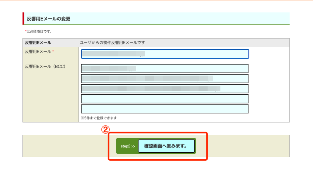 ②「反響用Eメール(Bcc)」に転送用メールアドレスを入力し、「確認画面へ進みます。」をクリック