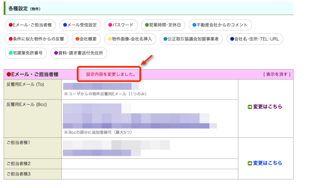 【Eメール・ご担当者様】欄 「反響用Eメール(Bcc)」項目に転送用メールアドレスを追加します。