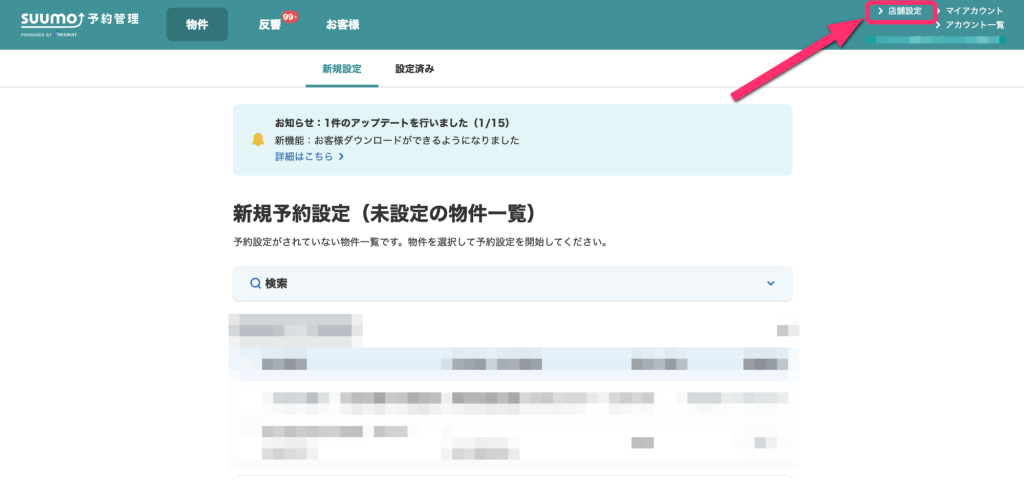 ②画面右上のメニューから「店舗設定」をクリックしてください。