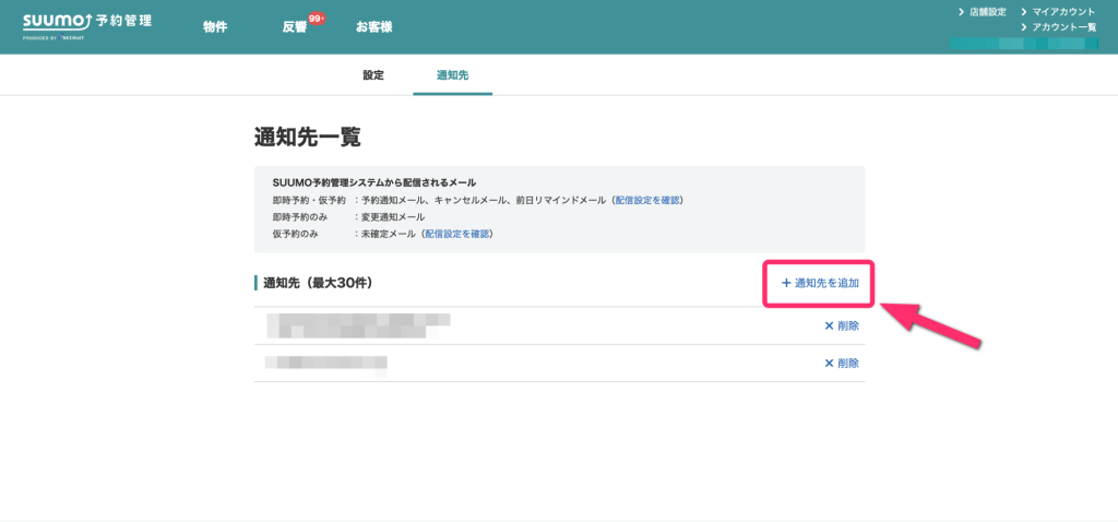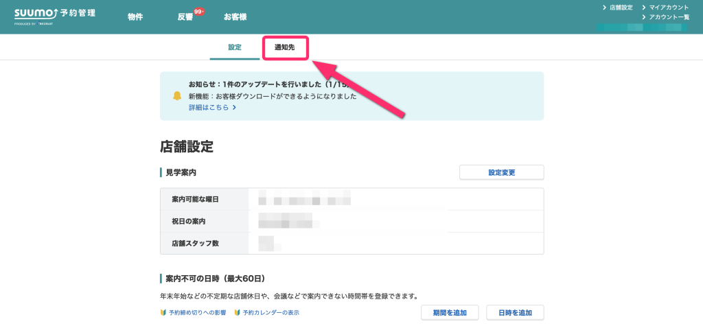 ③「店舗設定」ページに遷移後、「通知先」タブをクリックしてください。