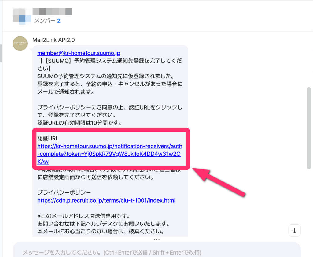 ①認証するために、受信したメッセージを確認し「認証URL」をクリックします。(画像の例はLINE WORKSに転送した場合です。)